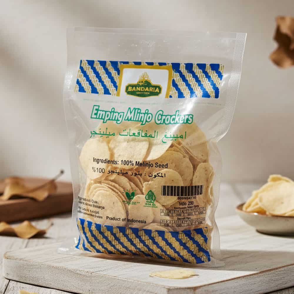 Emping Mlinjo is a distinctive Indonesian cracker made from melinjo seeds (Gnetum gnemon), showcasing Indonesia’s unique botanical heritage through its characteristic nutty flavor with subtle bitter notes. Each cracker is individually handcrafted by skilled artisans who carefully pound, flatten, and sun-dry the seeds before frying them to achieve their signature golden-yellow color and delicate crispness. Rich in antioxidants and traditionally served alongside Indonesian soups like soto or sayur asem, Emping offers an authentic taste experience that reflects Indonesia’s dedication to preserving artisanal food traditions.